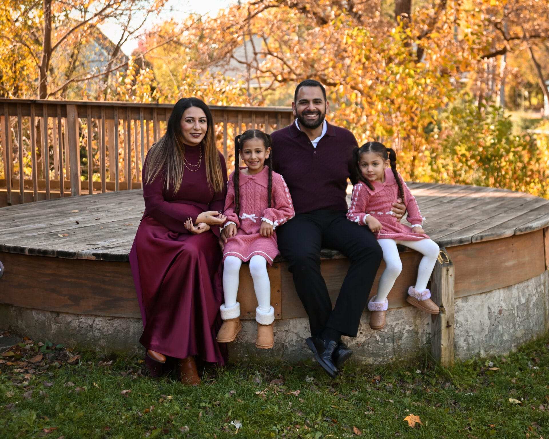 A family of four sits together on a wooden platform outdoors in autumn, all wearing coordinated burgundy and pink outfits and smiling at the camera.