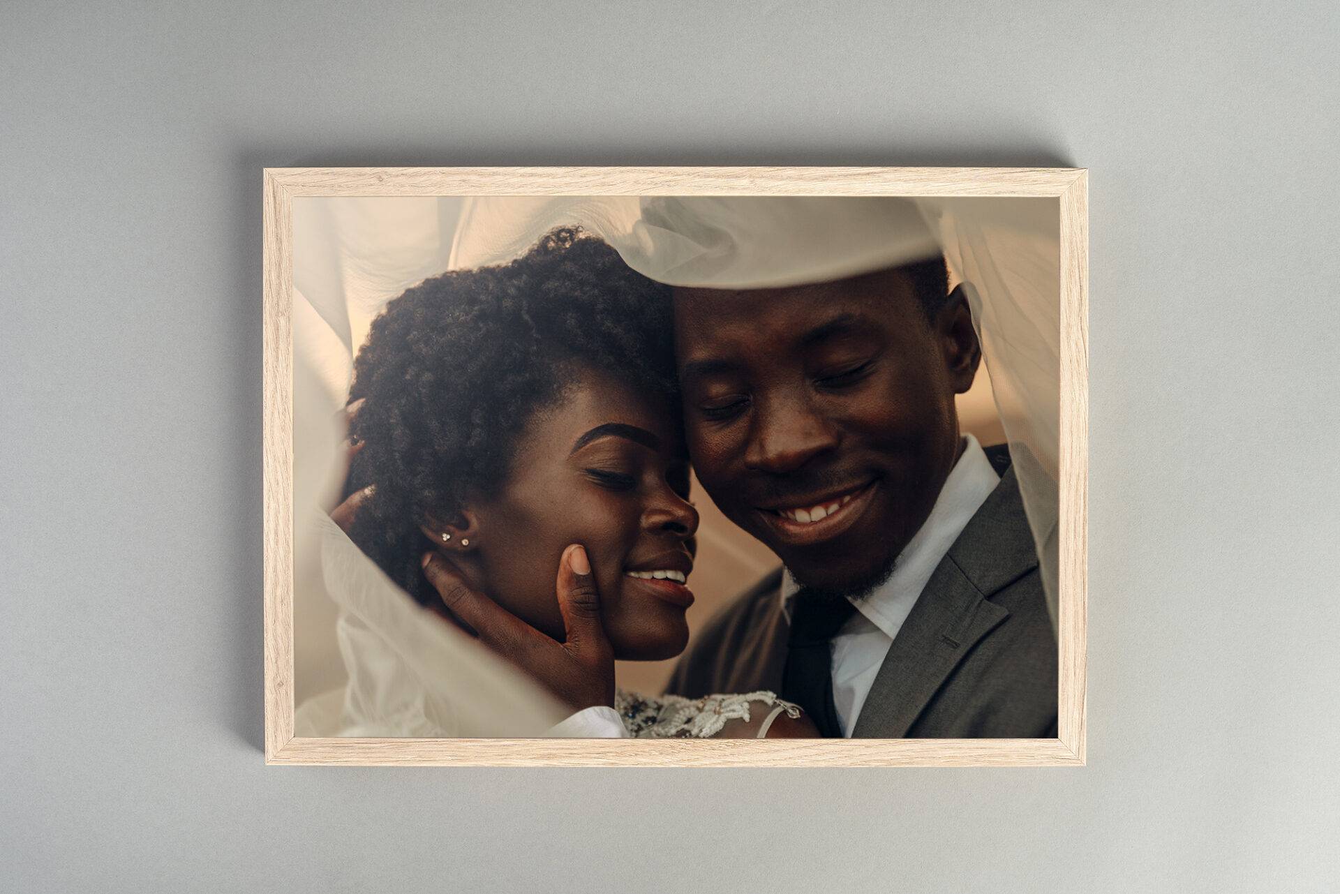 A smiling couple poses closely, wrapped in a light fabric. The woman has short curly hair, and the man is wearing a suit. The image is framed with a light wooden border.