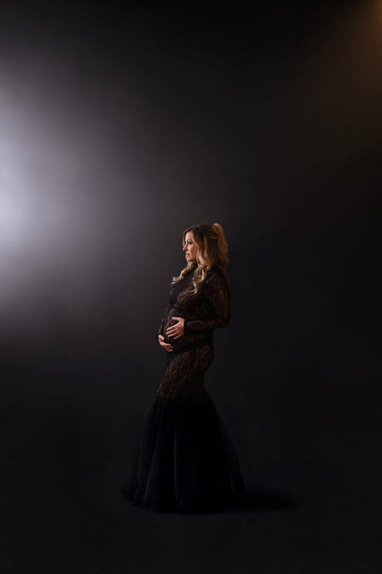 A pregnant woman in a long, black lace dress stands in profile against a dark background, holding her belly with both hands.