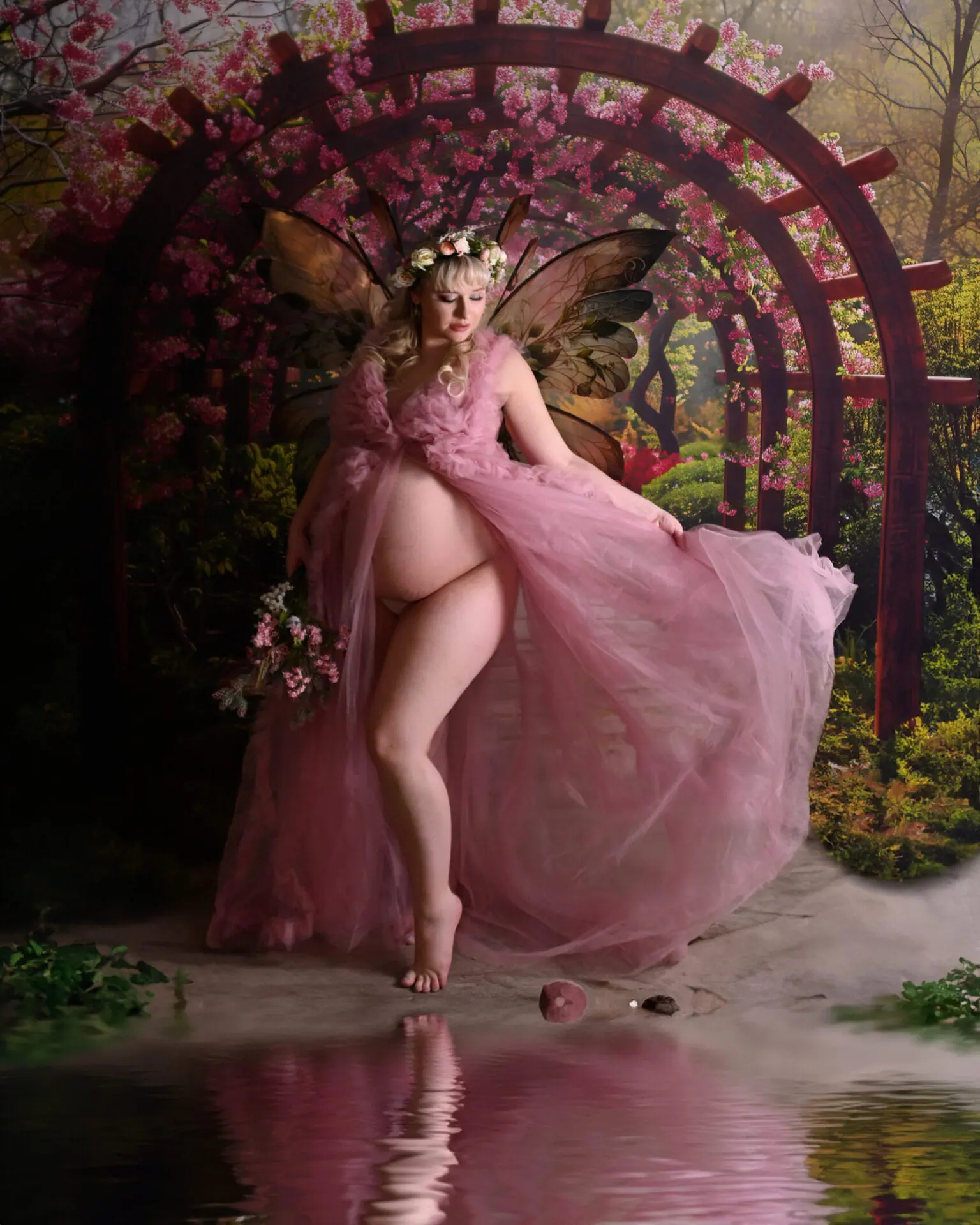 A pregnant woman wearing fairy wings, a pink sheer gown, and a flower crown stands barefoot by a pond, holding flowers, with a floral garden arch and pink blossoms in the background.