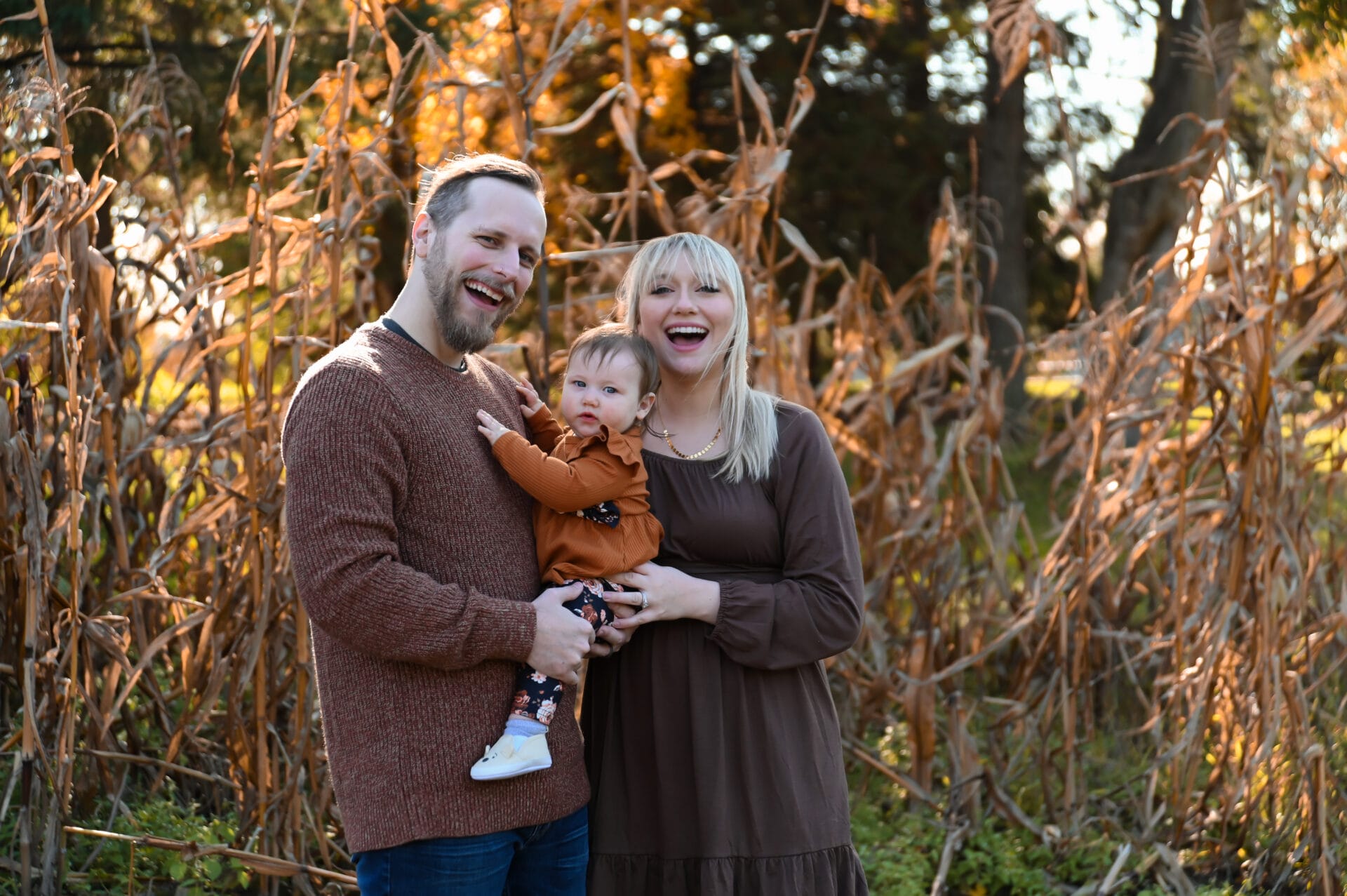 A smiling man and woman stand outdoors in front of tall dried plants, holding a small child dressed in autumn clothing.