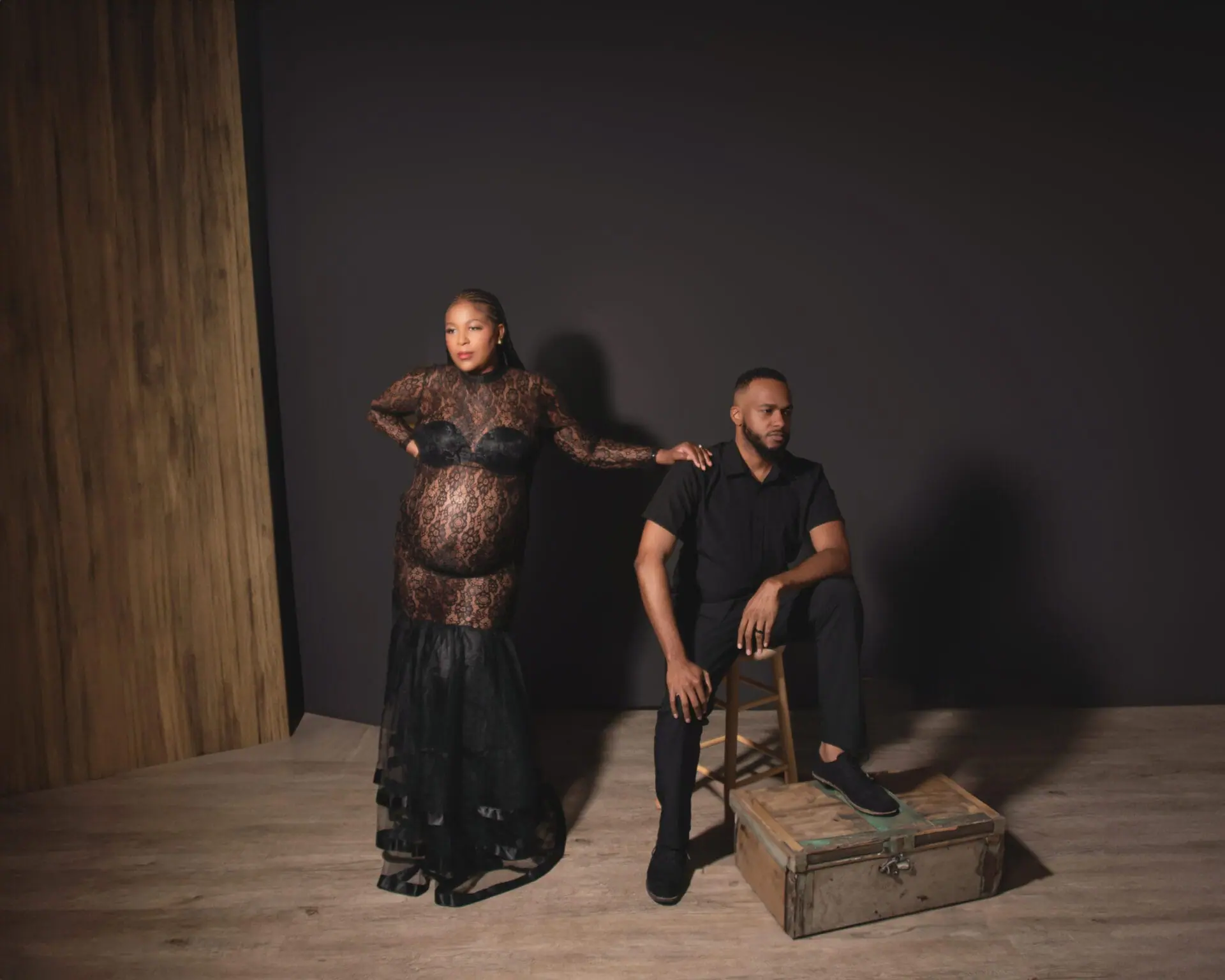 A pregnant woman in a black lace dress stands beside a seated man dressed in black, against a dark backdrop with a wooden floor and wall.