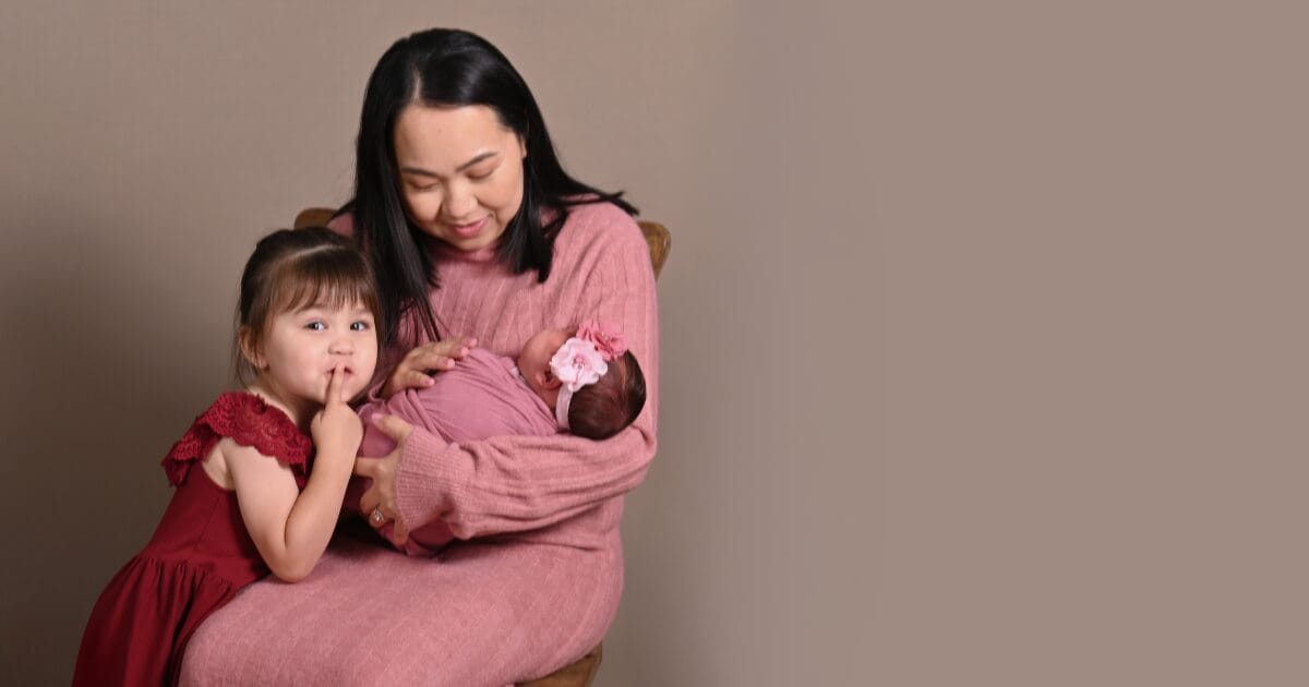 A woman in a pink dress holds a swaddled baby while a young girl in a red dress sits beside them, making a shushing gesture.