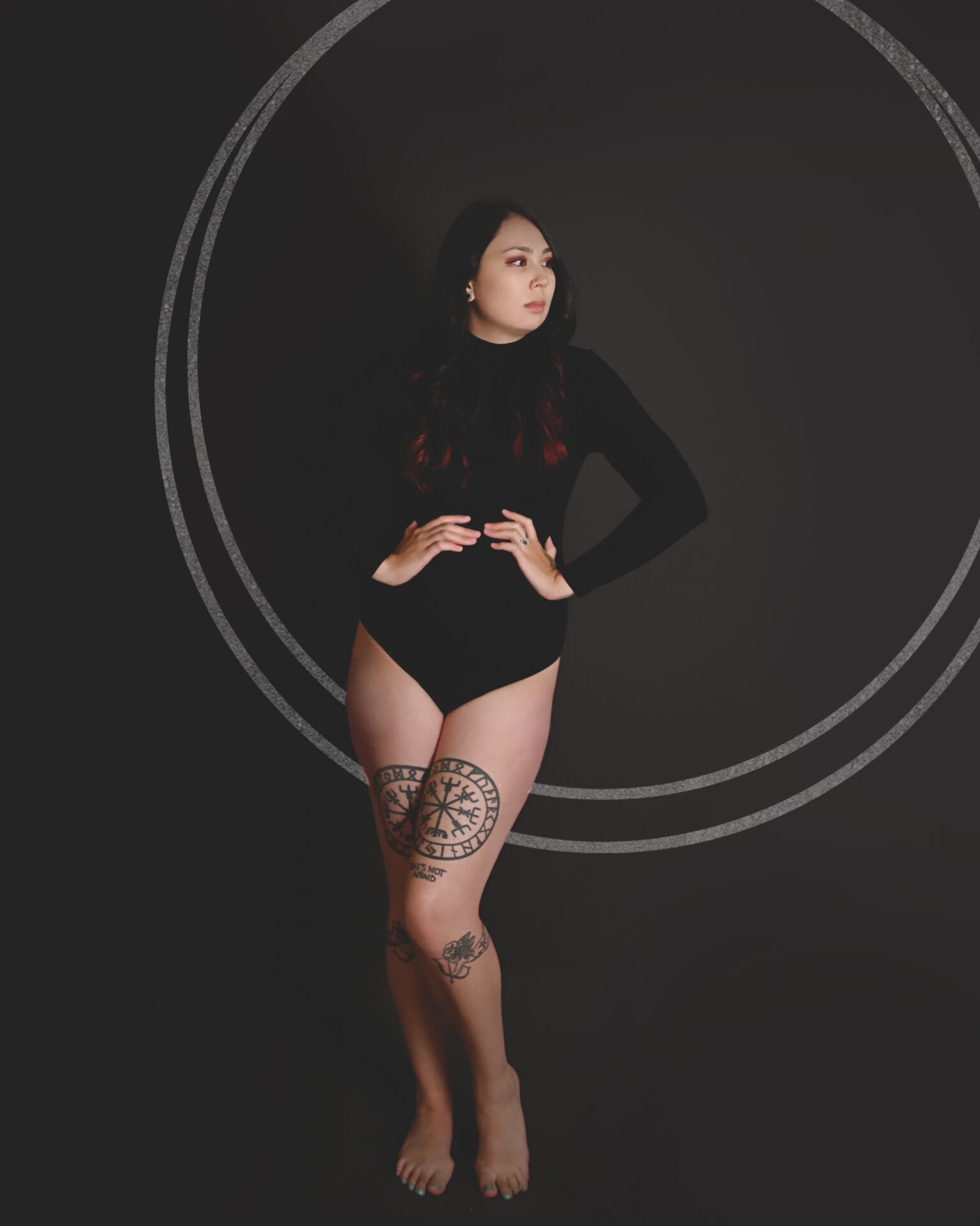 A woman in a black bodysuit stands barefoot against a dark background with circular patterns, showing tattoos on her left thigh and shin.