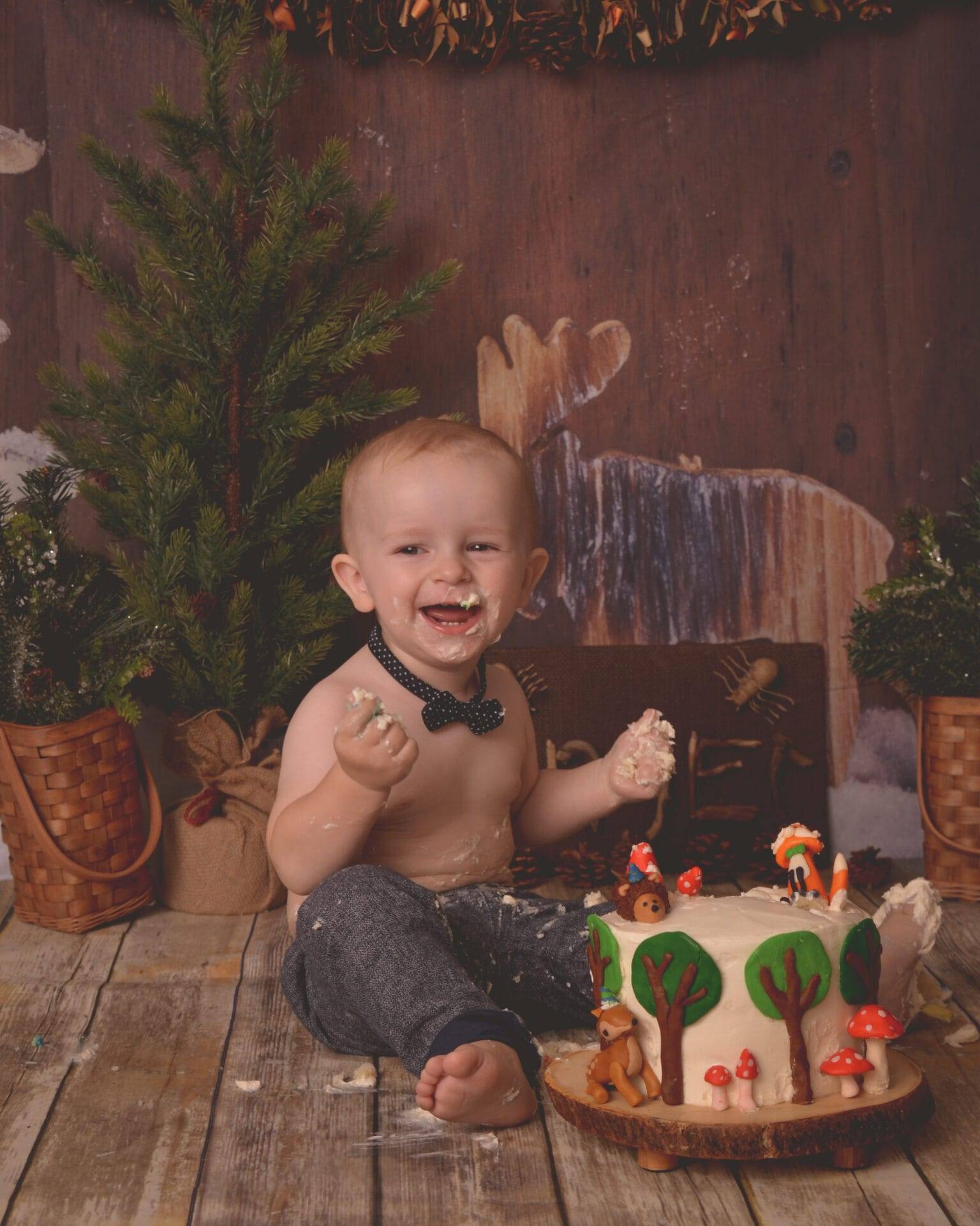 A smiling toddler with a bow tie sits on a wooden floor, covered in cake, with a decorated woodland-themed cake and rustic forest decor in the background.