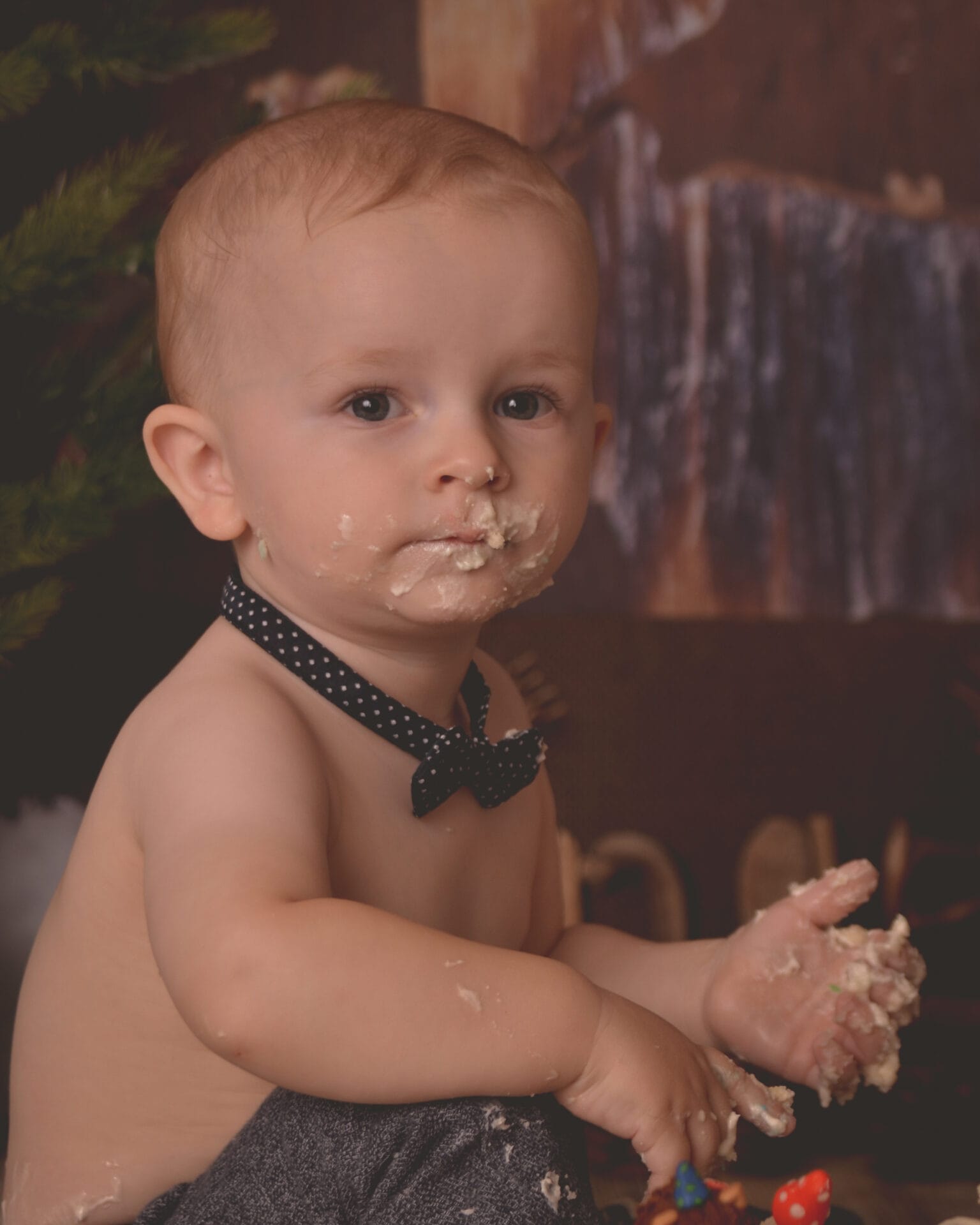 A baby wearing a black polka dot bow tie has cake or icing smeared on their face and hands, looking at the camera.