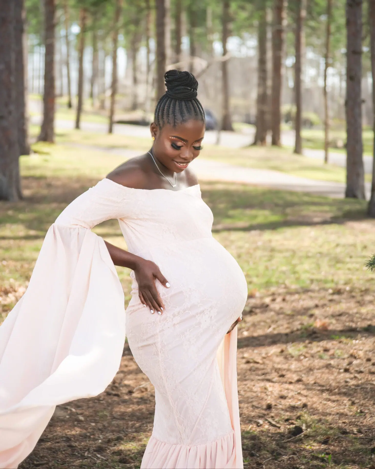 A pregnant woman in a light pink off-shoulder dress stands outdoors in a wooded area, holding her belly and smiling.
